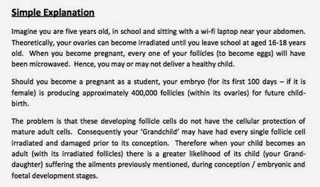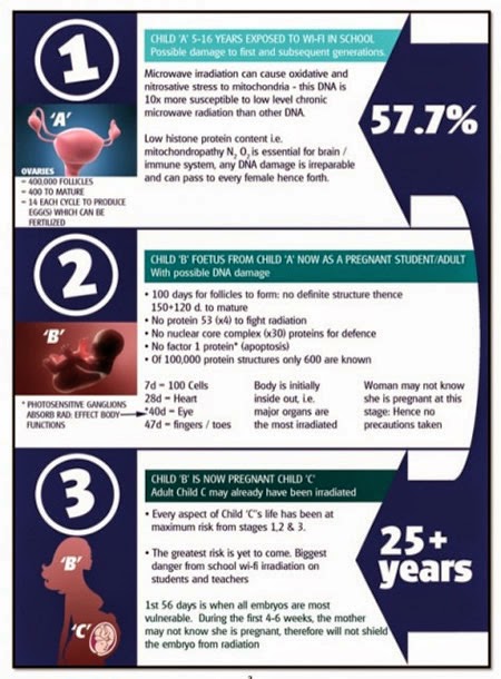The effects are cumulative across generations, where studies by the World Health Organization have established that women exposed to low level dosage of microwave irradiation (below thermal level, where it is felt as heat) had a 47.7% rate of miscarriages prior to the 7th week of gestation. The level of exposure in this case was five microwatts per centimeter squared, which is below what most school girls will receive in a classroom of wi-fi transmitters from the age of approximately five years upward, whose effects can include cancer, memory loss and birth defects.